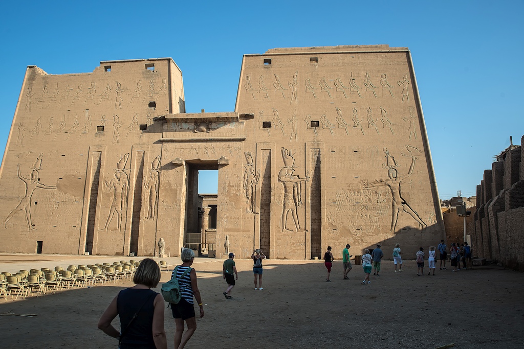 Horus gewidmet. Der Tempel gilt als einer der Best erhaltensten Tempel in ganz Ägypten. Fertiggestellt wurde er erst in Römisch-Griechischer Zeit, also um 200 v. Chr. Das gewaltige Eingangstor hat eine Höhe von fast 40 Metern und ist perfekt erhalten. Höher war nur das Tor vom Karnak-Tempel, das aber nicht komplett erhalten ist.