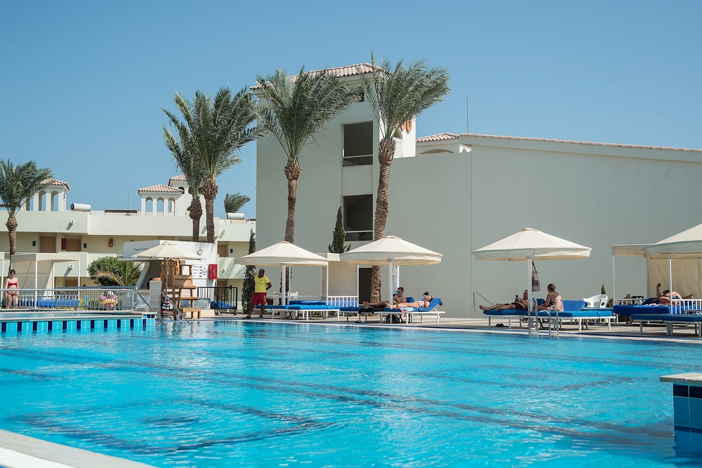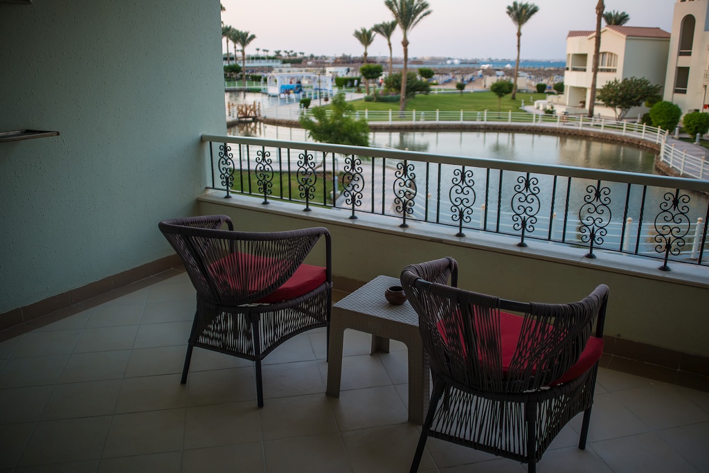Wir checkten ein und natürlich erhielten wir dieses mal wie auch gebucht ein Deluxe-Zimmer mit Meerblick. Ein Elektro-Bus brachte uns und unsere Koffer dort hin. Das Zimmer war wirklich toll und den Aufpreis wert. Es lag in der 1. Etage und der Blick auf das rote Meer vom Balkon war herrlich. Es lag in einer ruhigen Ecke der Anlage, da hier keine Bars waren, aber mit nur wenigen Schritten waren wir am Strand. Vor der Tür war eine Anlegestelle, von der wir mit einem Bootstaxi jederzeit andere Punkte der Anlage anfahren konnten.