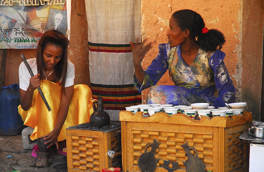 Anschliessend ging es zu einer Kaffeezerenonie. Da ich ja nicht hin laufen konnte, wurde ich kurzerhand von zwei einheimischen dort hin getragen. Kaffee, auf amharisch Buna, hat in Äthiopien einen besonderen Stellenwert. Überall sieht man Menschen Kaffee zubereiten und trinken. Die traditionelle Kaffeezeremonie ist fester Bestandteil des sozialen und kulturellen Lebens in Äthiopien und wird bis zu dreimal am Tag durchgeführt.