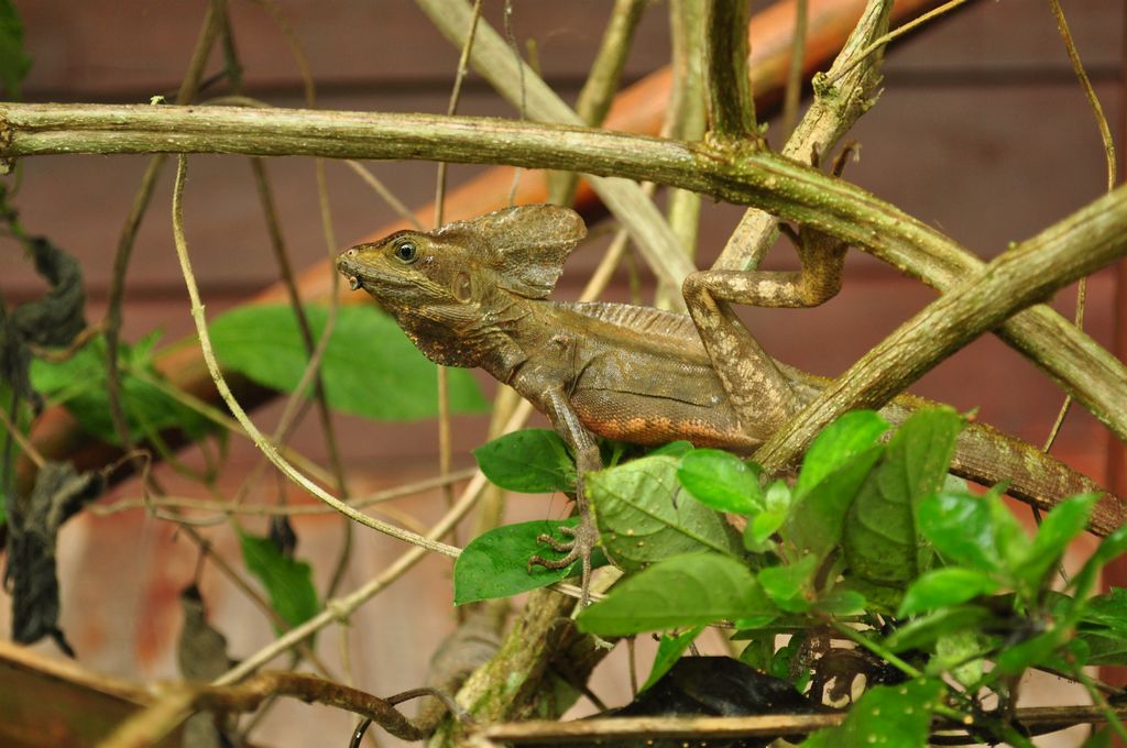Nachdem wir wieder im Camp waren (inzwischen hatte es wieder begonnen, in strömen zu regnen) gingen wir erstmal in unsere Unterkunft, um zu Duschen. Bald hörte auch der Regen wieder auf und ich entdeckte einen Basilisken im Gebüsch, der bereitwillig für mich Fotomodel spielte.