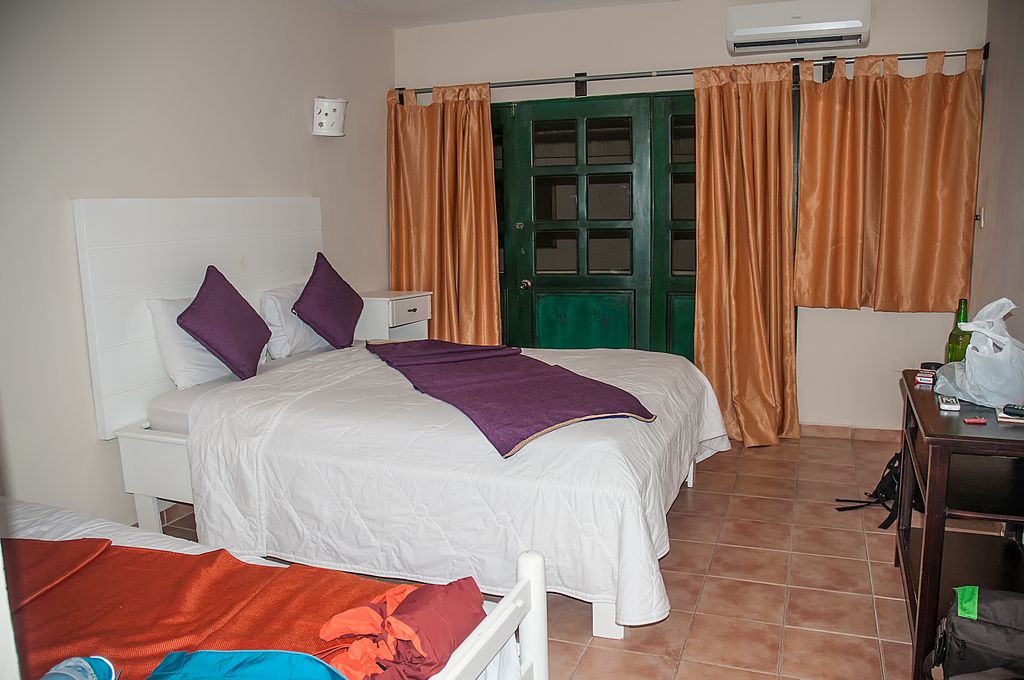 Es war gehobene Mittelklasse mit einem angrenzenden Casino und überfülltem Parkplatz vor dem Eingang, so dass wir kaum vorfahren konnten. Unser Zimmer war recht groß, lag in der 3.Etage eines Hochhauses und hatte einen großen Balkon mit Blick auf den Pool, Teppichboden und getrennte Betten. Es gab einen kleinen Röhren-Fernseher mit SAT, Aber nur DW in spanisch. Weiterhin einen leeren Minikühlschrank und eine Klimaanlage. Ein Aschenbecher auf dem Balkon fehlte.