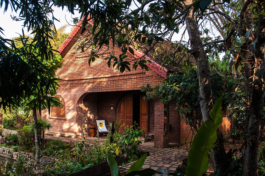 Hütte mit Veranda und 2 Sitzplätzen mit Blick in den Garten. Hinter dem Garten war ein Fluss mit einer Fussgängerbrücke. Im Fluss wurde die Wäsche des Hotels gewaschen. Auf der anderen Flusseite begannen die Berge mit dichtem Regenwald.