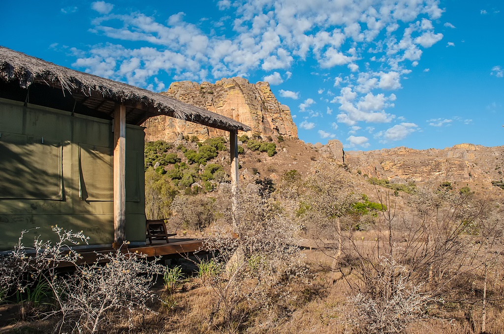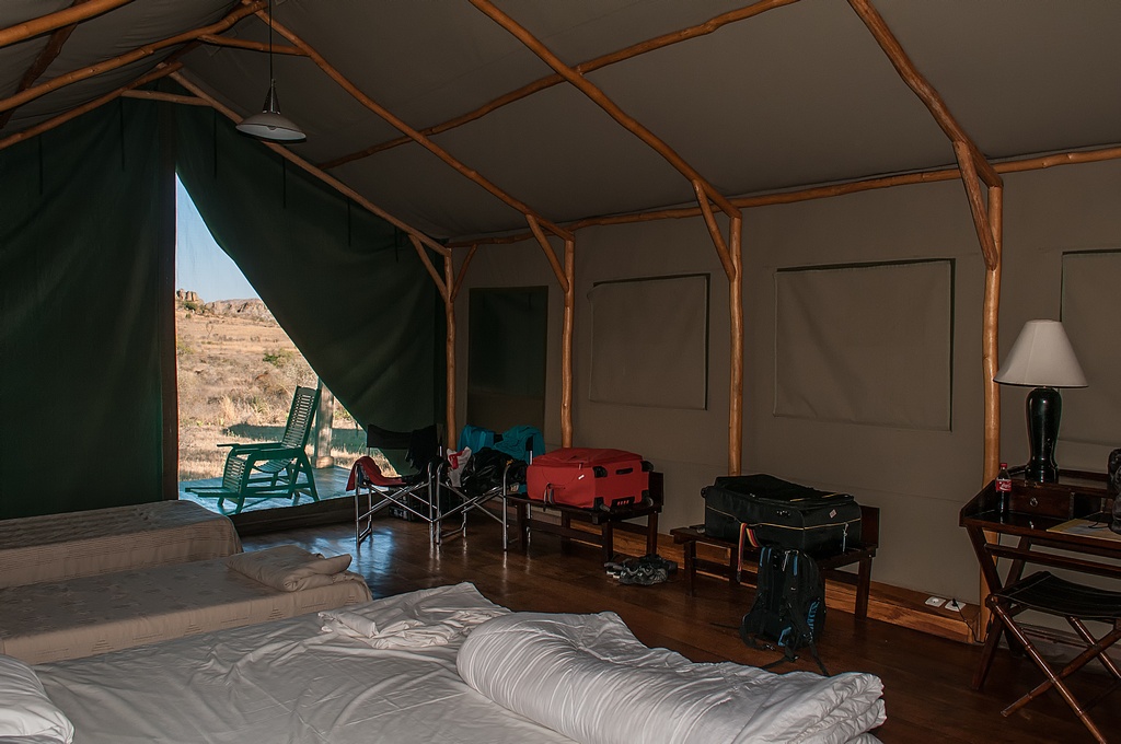Die "Satrana Lodge" in Ranohira lag mitten in der Natur. Die Zimmer waren eigentlich riesige Zelte mit Holzboden und einem Strohdach. Angebaut waren an einer Seite eine Terrasse mit Liegestülen und an der anderen Seite ein gemauertes Bad. Aus dem Bad gelangte man in einen eigenen Innenhof mit einer weiteren Dusche im freien. Natürlich mit Warmwasser. Das Zelt war mit einem Doppelbett und 2 Einzelbetten ausgestattet. 2 Kofferständer, Schreibtisch und Sitzecke waren ebenso vorhanden.