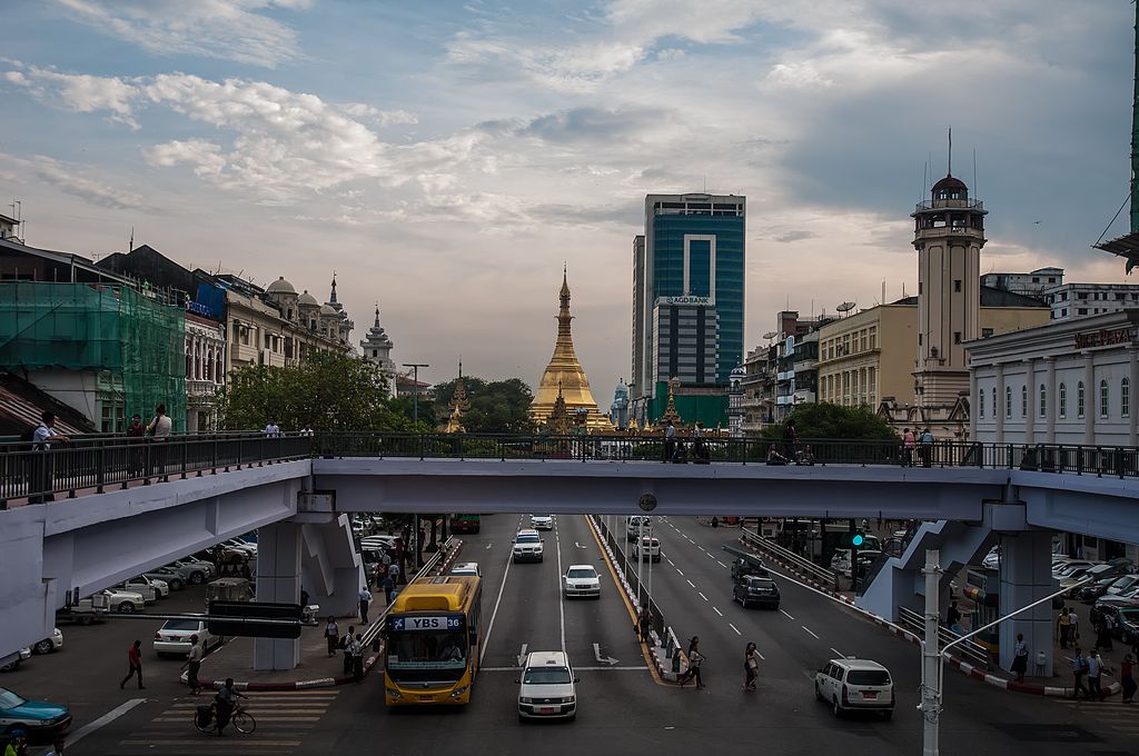 In den Straßen von Yangon (Blick auf die Shwedagon-Pagode).