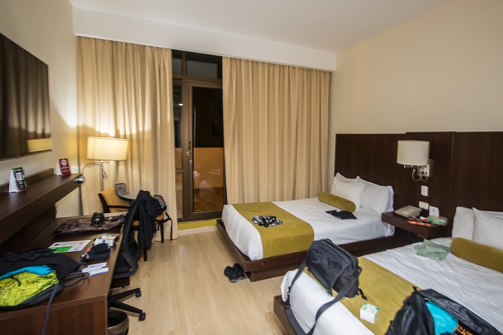 Das "Best Western Plus Panama Zen" in Panama City hatte 4 Sterne. Wir wurden auch am Ende der Reise für eine Nacht noch mal dort im Zimmer 507 untergebracht (das Zimmer war fast identisch mit 505, nur etwas anders aufgeteilt und hatte ein Doppelbett). Für den Fahrstuhl und das Zimmer erhielt man zwei unterschiedliche Magnetkarten. In der 15.Etage gab es eine Rooftop-Bar und ein Schwimmbecken. Einige wenige Zimmer in der 5.Etage hatten als einzige im Haus einen recht großen Balkon (Wichtig für Raucher). Das Zimmer hatte einen Laminatboden, Einzelbetten, Klima, eine leere Minibar, TV, Wasserkocher und TV. Einen Schreibtisch gab es auch. Die Dusche war sofort warm. Kostenloses WLAN gab es auch, aber man musste sich häufig neu anmelden. Restaurants, Bars und Läden gab es in der Nähe vom Hotel jede Menge.