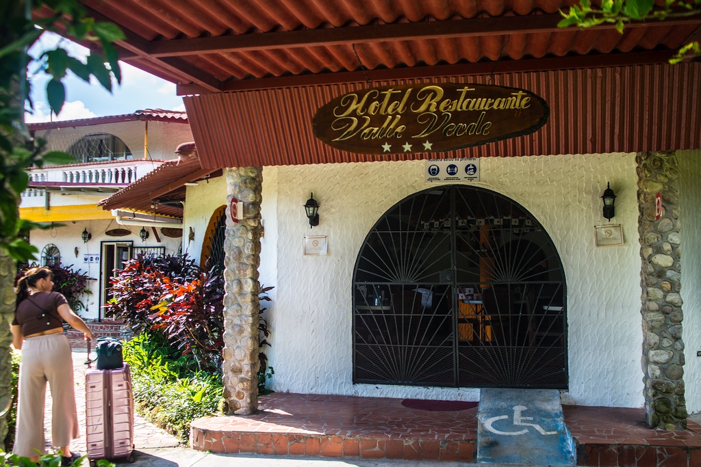 Das "Hotel Valle Verde" in El Valle de Antón hatte 3 Sterne. Die ganze Eco-Lodge lag in einem wunderschönen Garten in Mitten der Natur. Es gab draußen natürlich auch einen Pool. Restaurants waren innerhalb 15 Minuten zu Fuß erreichbar. Unser Zimmer lag im Erdgeschoss und hatte eine überdachte Terrasse mit Tisch und Stühlen. Das Zimmer mit Doppelbett war aber sehr klein, so das wir kaum Platz hatten, unsere Koffer hin zu legen. Es gab natürlich eine Klimaanlage, TV und kostenloses WLAN. Der Boden war gefliest. Dusche und Warmwasser funktionierten ebenfalls. Einen Fön gab es nicht.