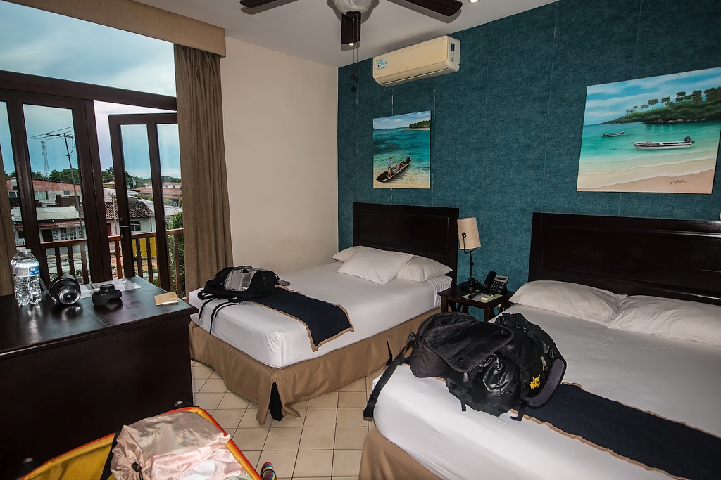 Das "Hotel Presidente" in Las Tablas hatte 5 Sterne. Es war ein recht altes Haus, lag in der City und hatte einen offenen Innenhof. Eine Bar und das Restaurant waren im Erdgeschoss. Unser recht kleines Zimmer lag in der 1.Etage und hatte als eines der wenigen einen sehr kleinen Balkon. Es gab einen leeren Kühlschrank, TV, eine warme Dusche, Wasserkocher, Klima und einen Deckenventilator. Der Boden war gefliest und es gab Einzelbetten. Auch gab es ein kostenloses WLAN. Einen Fön gab es nicht. Bars und Restaurants waren in unmittelbarer Umgebung des Hotels.