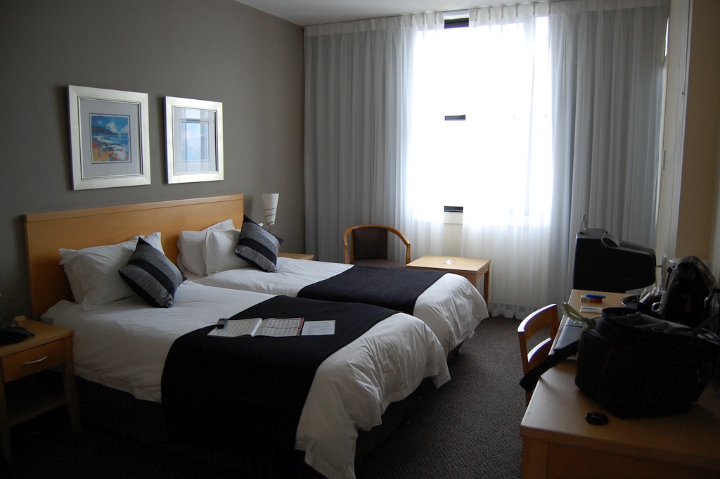Unser Zimmer im Premier-Hotel in Pretoria war ausgestattet mit einem (leeren) Kühlschrank, LCD-TV, Klimaanlage, Safe, einen geräumigen Bad mit Dusche, Wanne und Fön. Der Raum hatte Teppichboden und das Fenster zeigte zur Hauptstrasse. Innerhalb des gesamten Hotels ist das Rauchen verboten. Es gab einen sehr kleinen Pool (1,1 bis 1,5 m tief) im kleinen Garten mit einer noch kleinerer Liegewiese, ein gutes Restaurant und eine ebenso gute Bar. Obwohl das Hotel direkt an einer Hauptstrasse lag, hört man den Strassenlärm kaum. Vor dem Hotel, dessen Zäune zusätzlich mit Natodraht geschützt waren, patroulierte ständig die Security des Hotels. Die Preise für das Essen im Hotel waren OK.