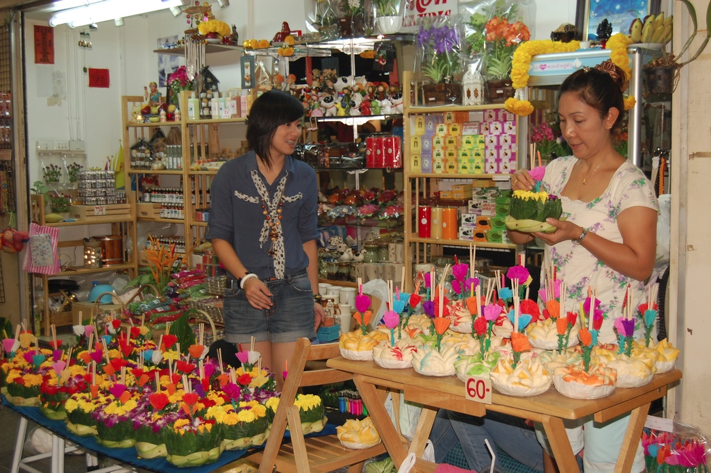 In den Läden verkaufen sie die Gebinde (Krathongs) aus Bananenblättern, Blumen, Kerzen und Räucherstäbchen für etwa 60 Bart.