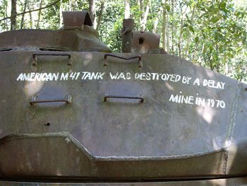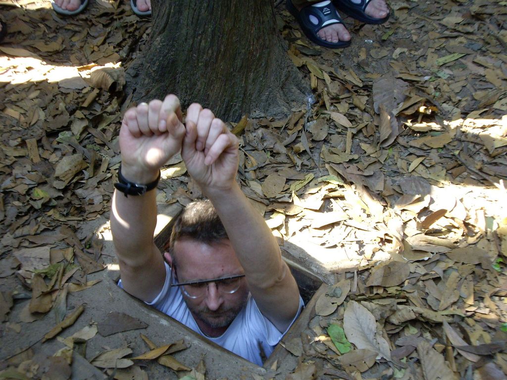 Morgens um 7:00 brachen wir mit dem Reisebuss auf, um die Vietkongtunnel am südlichen Ende des Ho-Chi-Minh-Pfads in Chu Chi zu besichtigen. Da wir früh abgefahren waren, waren auch noch nicht viele Touristen dort. Zuerst wurde uns ein alter Propagandafilm über die Bedeutung der Tunnel im Vietnamkrieg gezeigt. Das Tunnelnetz ist 200 Km lang und hat teilweise bis zun 3 Etagen. Die Tunnel sind 60 * 80 cm und sind unbeleuchtet. Teilweise gab es Küchen, Krankenhäuser und Werkstätten unter der Erde. Das Gelände war 8 Jahre lang duch die Dioxin-Bomben der Amerikaner verseucht und unfruchtbar, bis die ersten Urwaldpflanzen wieder zu wachsen begannen.
